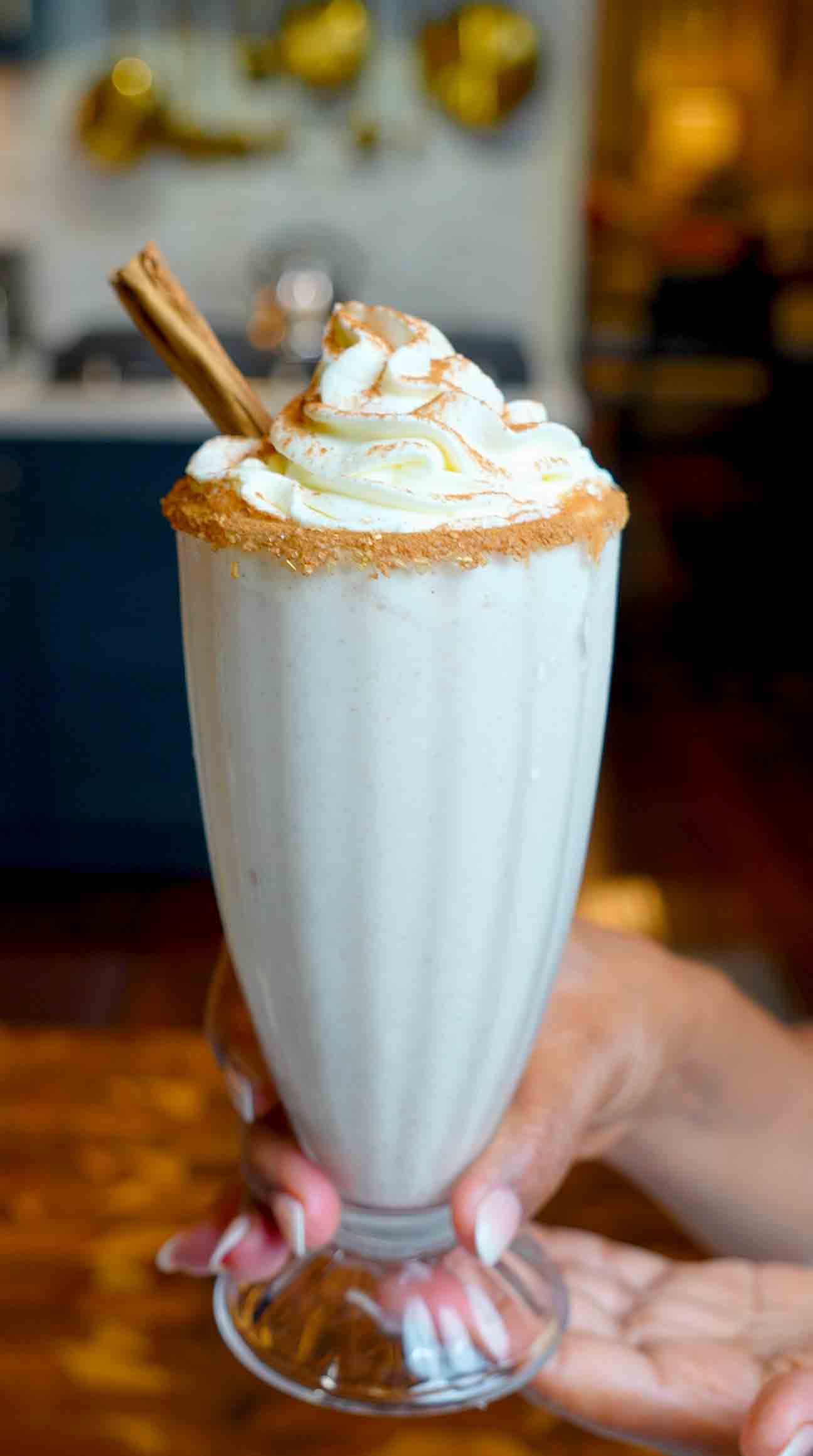 - Pour and Garnish Carefully pour the horchata-inspired milkshake into your prepared cinnamon-sugar rimmed glasses, being careful not to disturb the sugar rim. Fill each glass almost to the top, leaving room for toppings. Top each shake with a generous swirl of whipped cream. Finish with a light dusting of ground cinnamon sprinkled over the whipped cream for that beautiful finishing touch and extra cinnamon aroma.