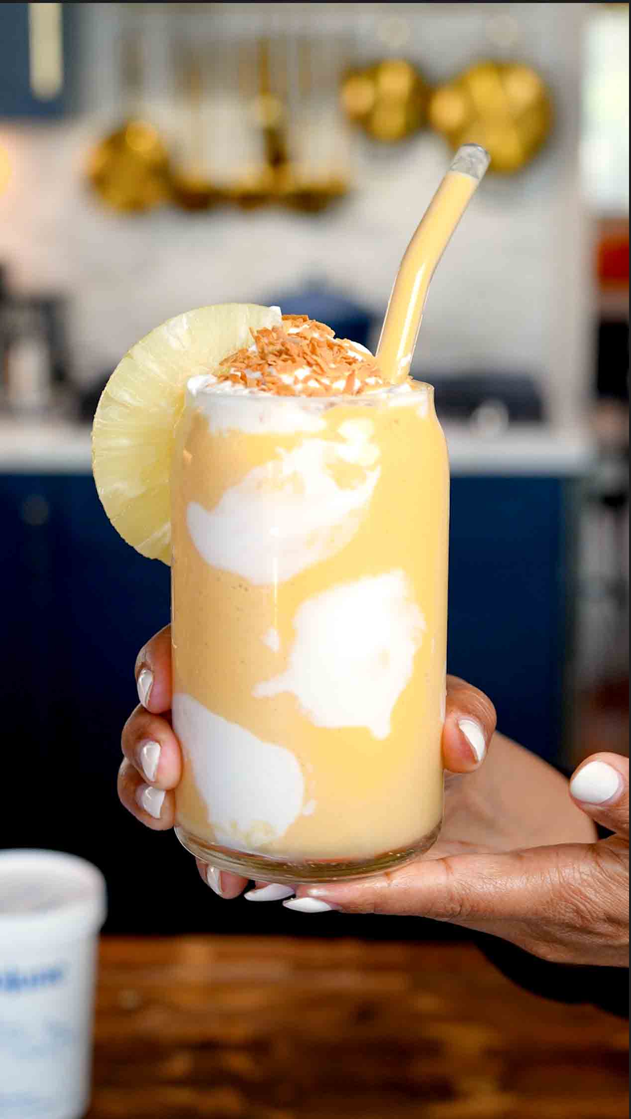 This pineapple coconut dream smoothie is the creamiest, dreamiest way to start your day with tropical vibes! Frozen pineapple chunks and frozen mango blend with a ripe banana, creamy Cocojune organic coconut yogurt, and pineapple juice to create this incredibly smooth, thick, and luxurious smoothie that tastes like you're sipping breakfast on a beach somewhere tropical. The Cocojune coconut yogurt is the secret weapon here, adding incredible creaminess, tang, and probiotics without any dairy. It makes the smoothie thick enough to eat with a spoon but still pourable and refreshing. The frozen fruit creates that perfect frosty texture while the banana adds natural sweetness and helps bind everything together. But what really makes this special is the presentation: before you pour the smoothie, you use a spoon to spread dollops of Cocojune yogurt on the inside of your glass, creating these gorgeous white yogurt clouds that look absolutely stunning against the golden-yellow smoothie. It's such a simple trick but makes your smoothie look bakery or café quality! The toasted coconut flakes on top add crunch and that toasty, nutty coconut flavor that takes this from good to incredible. You toast them in a dry skillet for just 2-3 minutes until golden and fragrant, and they add so much depth. A fresh pineapple wedge on the rim is optional but makes it feel extra special and Instagram-worthy. Every sip is creamy, tropical, naturally sweet, and packed with fruit, probiotics, and good-for-you ingredients. This is perfect for busy mornings when you want something quick but nourishing, post-workout fuel, or anytime you need a little tropical escape!